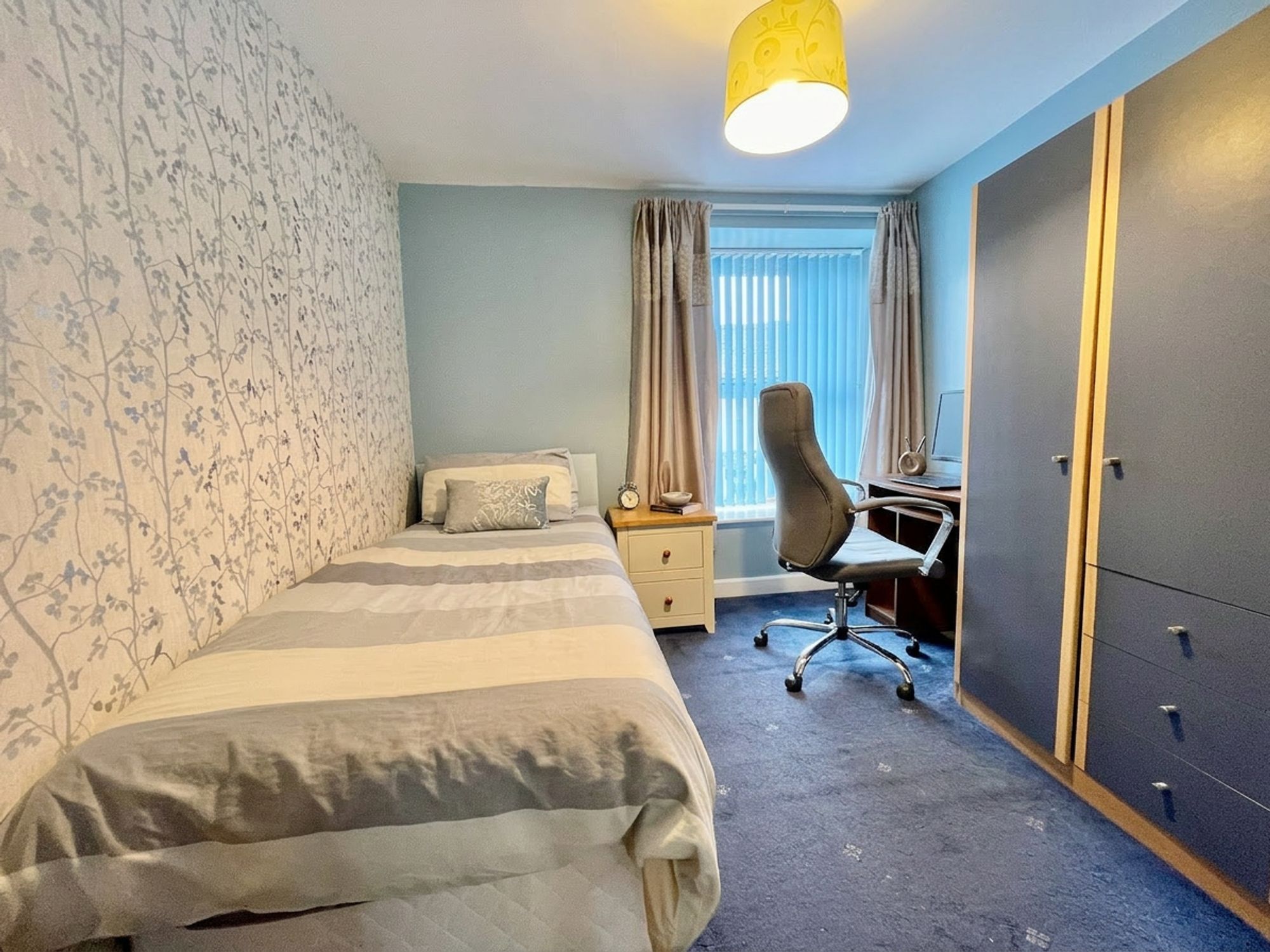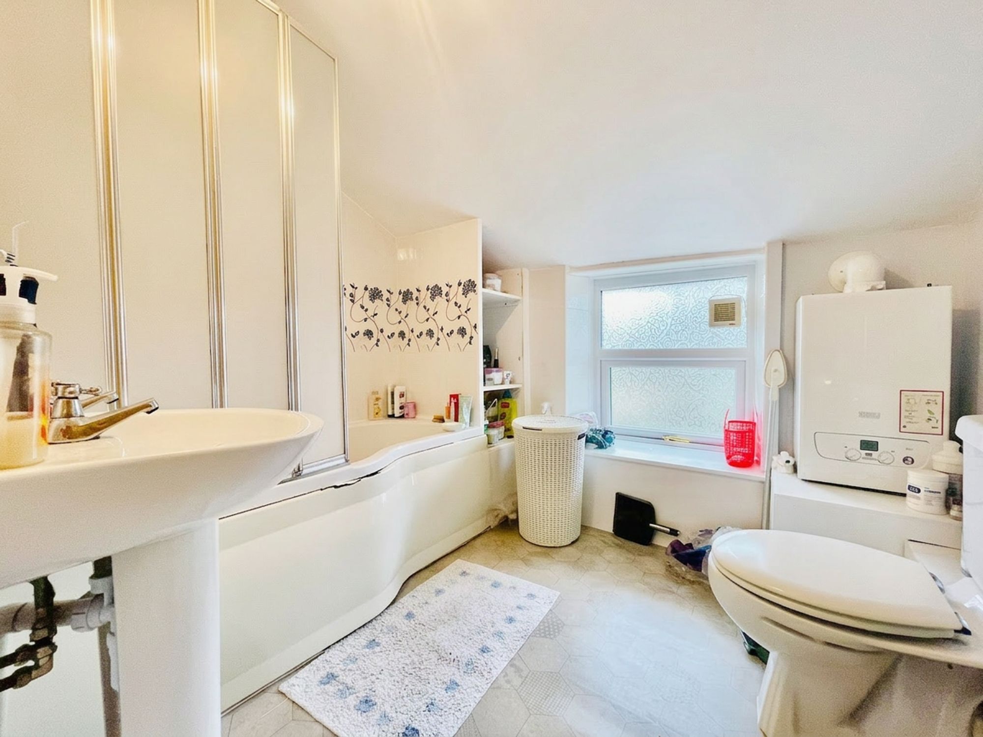 The family bathroom is fully tiled to ceiling height and comprises a panel bath with Mira electric shower, WC, pedestal wash hand basin, and a large heated chrome towel rail. The combi boiler is also housed here and remains under warranty.