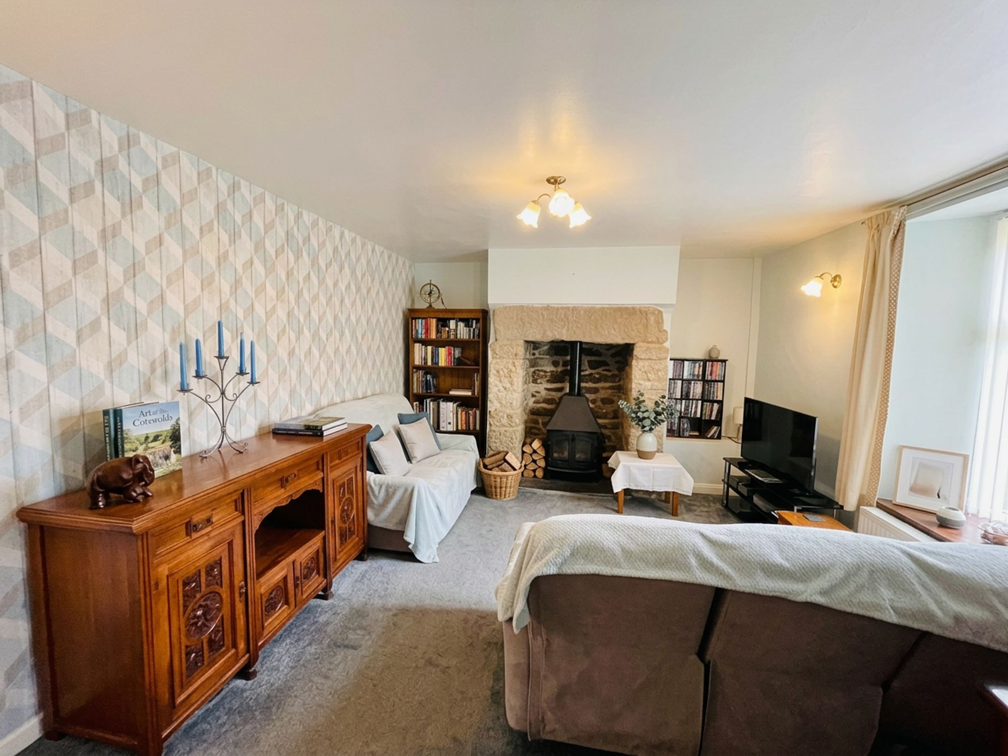 Upon entering, the hallway provides a practical space for coats and shoes, with stairs leading to the first floor and a door into the impressive lounge. The lounge is welcoming and well-presented, featuring a beautifully restored inglenook fireplace that serves as a striking focal point. Smooth walls and ceilings, feature wallpaper, a radiator, and a uPVC double-glazed window to the front elevation complete the room’s characterful charm.