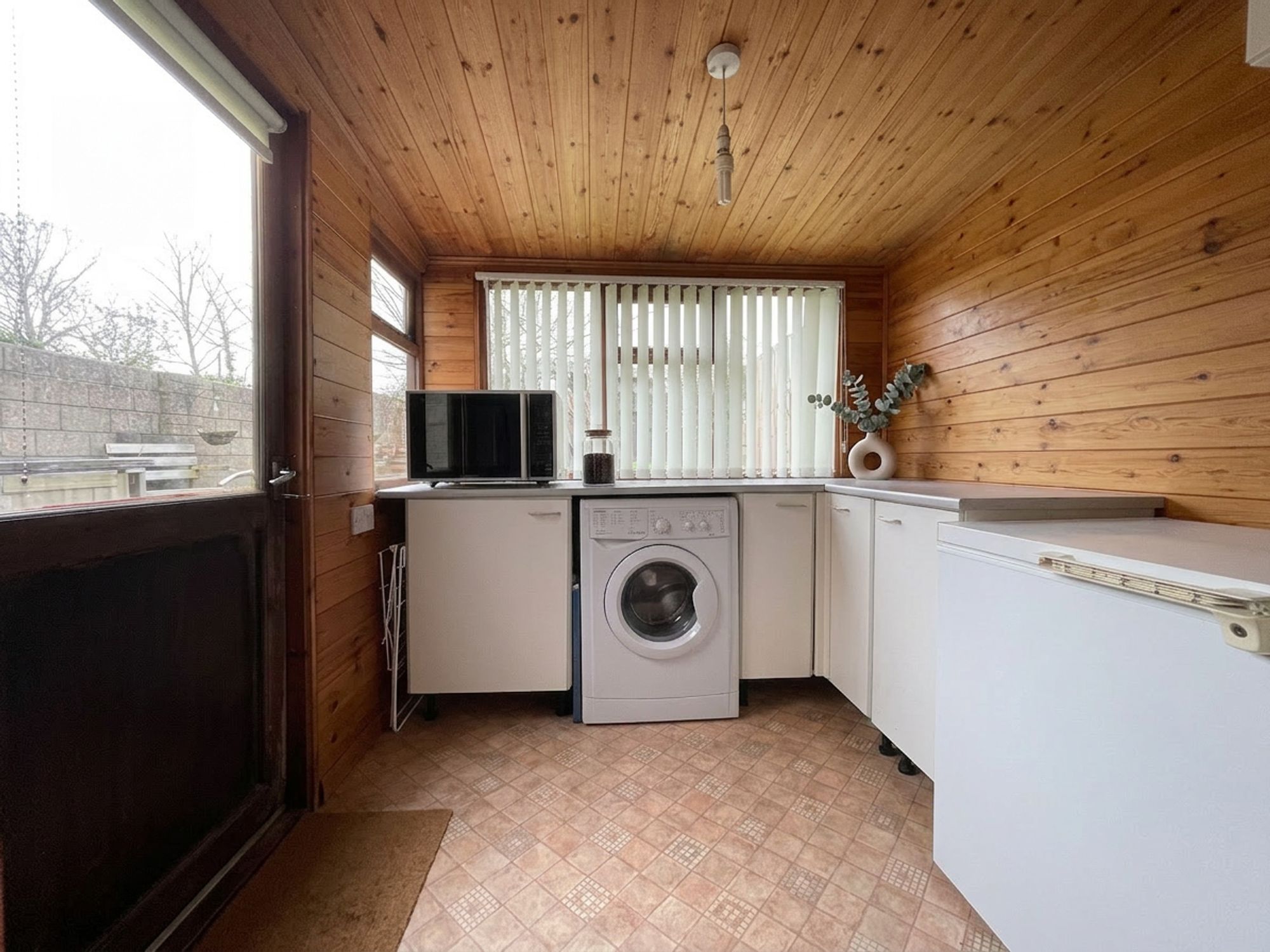 The wooden utility extension adds practical space, complete with pendant lighting, power points, and room for appliances including a fridge freezer. This area flows seamlessly into the kitchen/dining room. It is worth noting that there is no access to drainage or water in the extension at present.