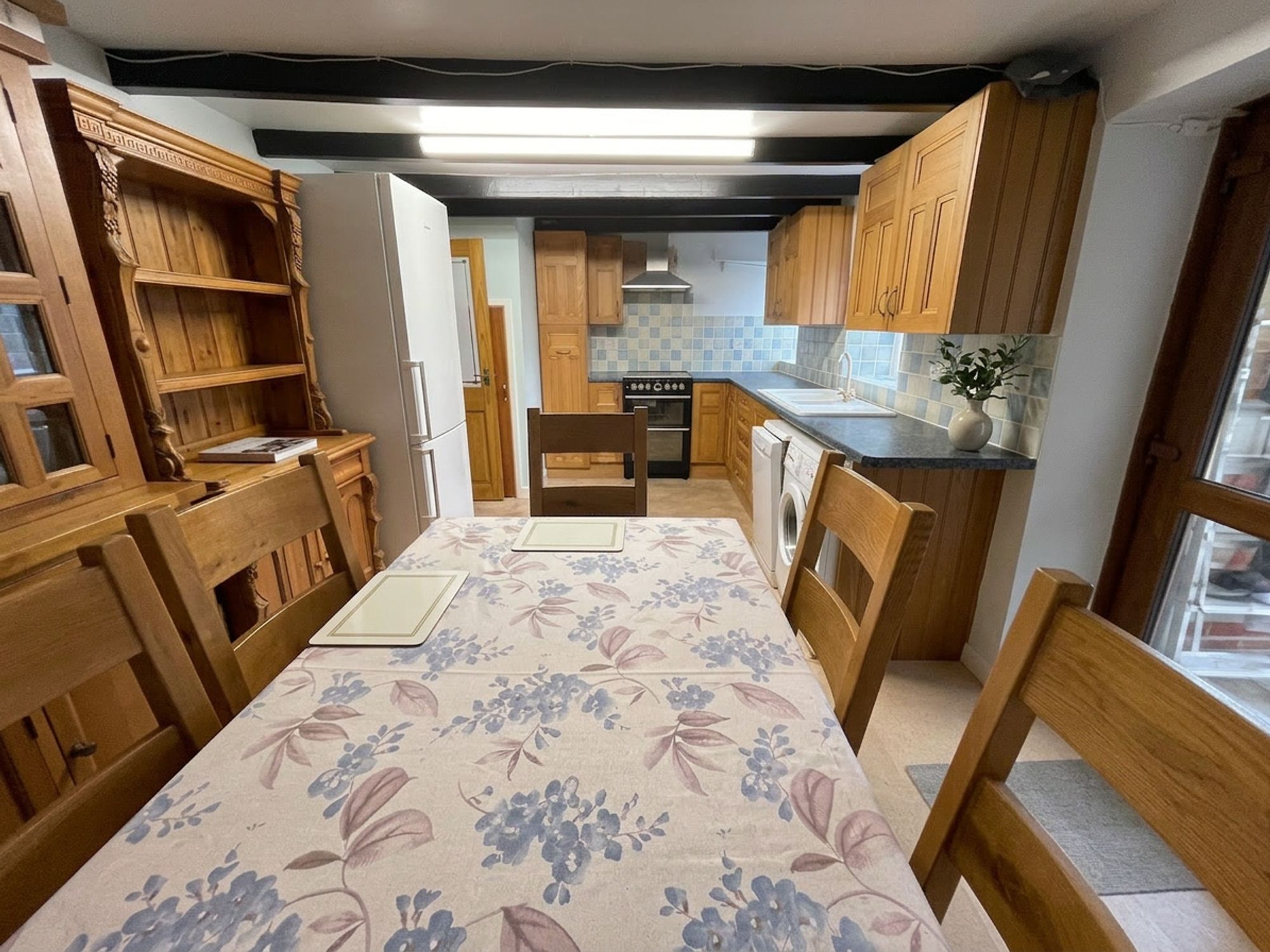 The lounge leads seamlessly into the kitchen/dining room. This spacious area is well-equipped, featuring ample worktop space, a 1.5-bowl sink with swan-neck tap, and a range of wall and base units with solid wooden carcasses. There is space for an electric oven with extractor hood as well as additional appliances . Located next to the oven is an additional gas connection allowing for a duel fuel cooker. Two uPVC double-glazed windows fill the room with natural light, while exposed beams add character. A handy under-stairs storage cupboard provides extra practicality. The dining area is generously sized, comfortably accommodating a large table for eight—perfect for entertaining. A door from the dining area leads into a purpose-built wooden storage room, which in turn opens to the rear garden.