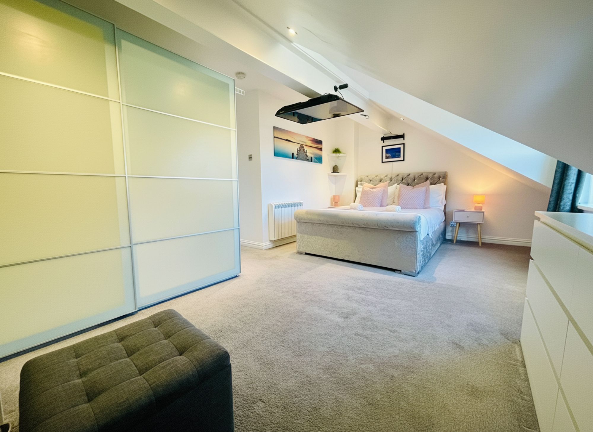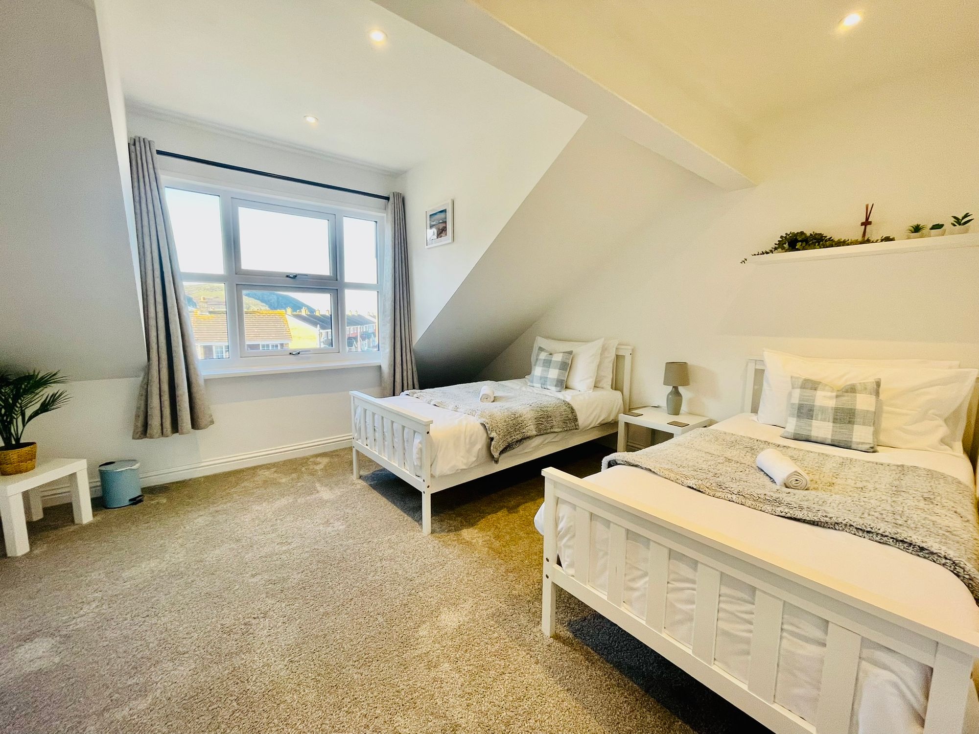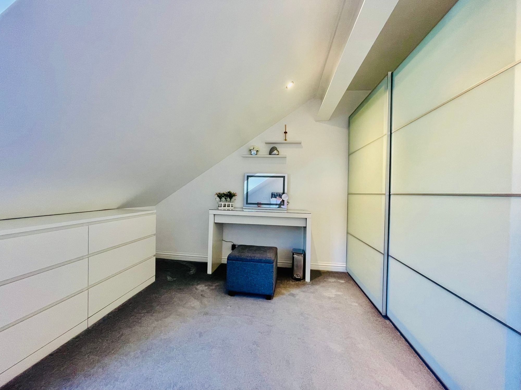 Another generous double bedroom, beautifully decorated and presented. Featuring LED lighting, electric heating, built-in wardrobes, TV points, and a large UPVC double-glazed window overlooking the rear elevation. Again, there is a slight head height restriction, but this remains a very comfortable and well-proportioned double room.
