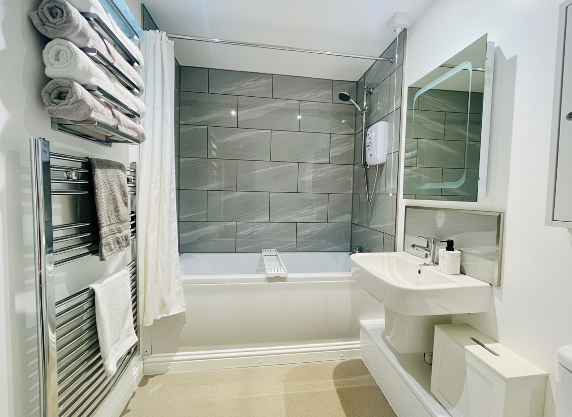 A sleek and contemporary family bathroom, again finished to an exceptional standard. Featuring a white panelled bath with electric shower over, full-height gloss tiled splashbacks, wall-hung sink with grey tiled splashback, enclosed WC, chrome towel rail, speckled flooring, and an electric heated mirror. The finish is flawless and comparable to high-end boutique accommodation.