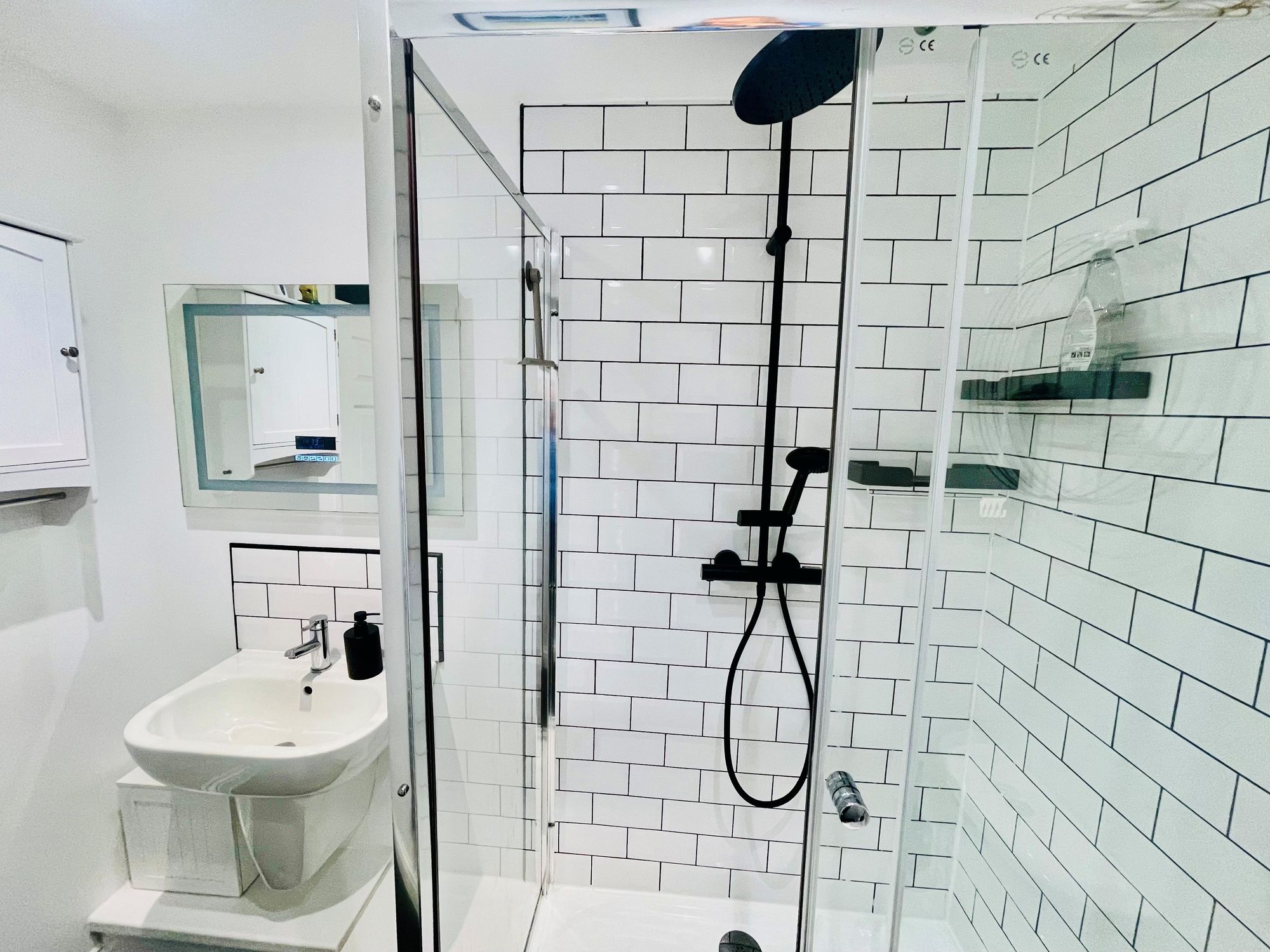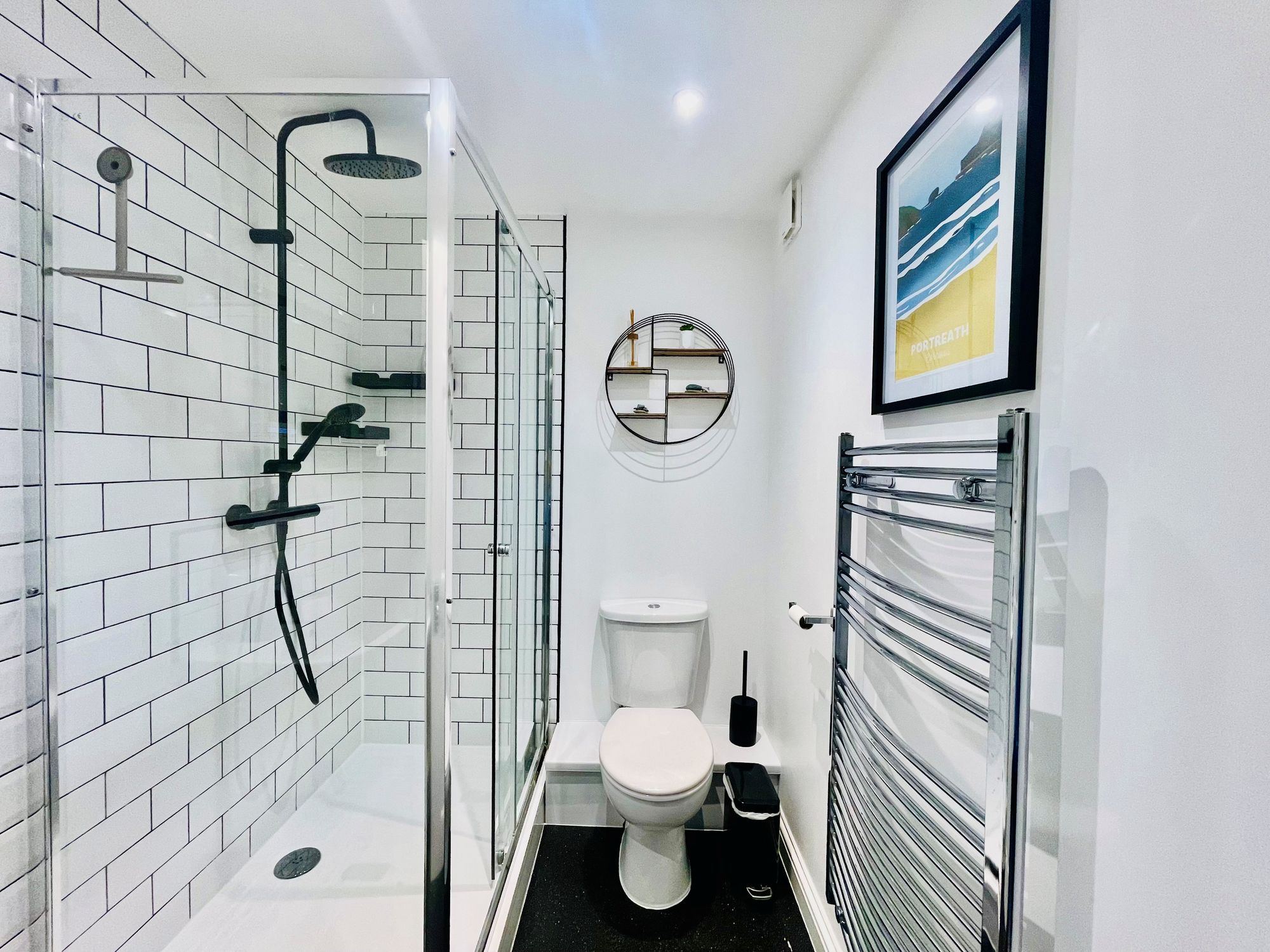 The ground floor also benefits from an absolutely outstanding boutique-style shower room, finished to an exceptional five-star hotel standard. Featuring sparkling grey flooring, full-height contemporary brick-style tiling, a large walk-in double shower with striking black waterfall head and separate attachment, wall-hung sink, LED lighting, chrome towel rail, enclosed WC, and a heated Bluetooth steam mirror. This room has been completely upgraded and is simply stunning.