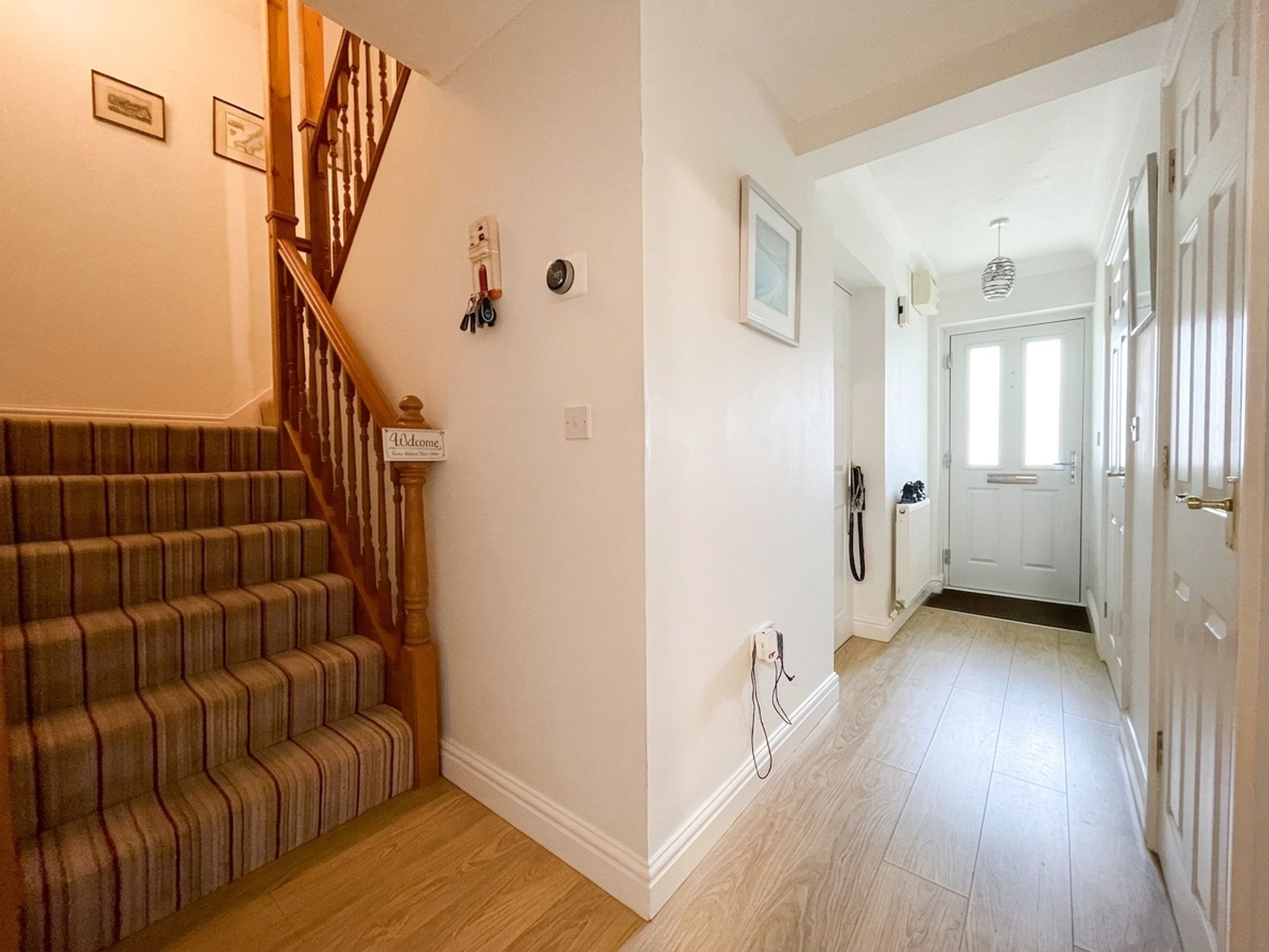 Upon entering the ground floor, a generous reception hallway immediately sets the tone, providing access to the integral garage, a stylish contemporary shower room, and a large utility room complete with ample storage, worktops, an inset sink, and space for white goods. A rear door opens directly onto the lower storage area and garden, enhancing the practicality of this level after beach days or countryside walks.