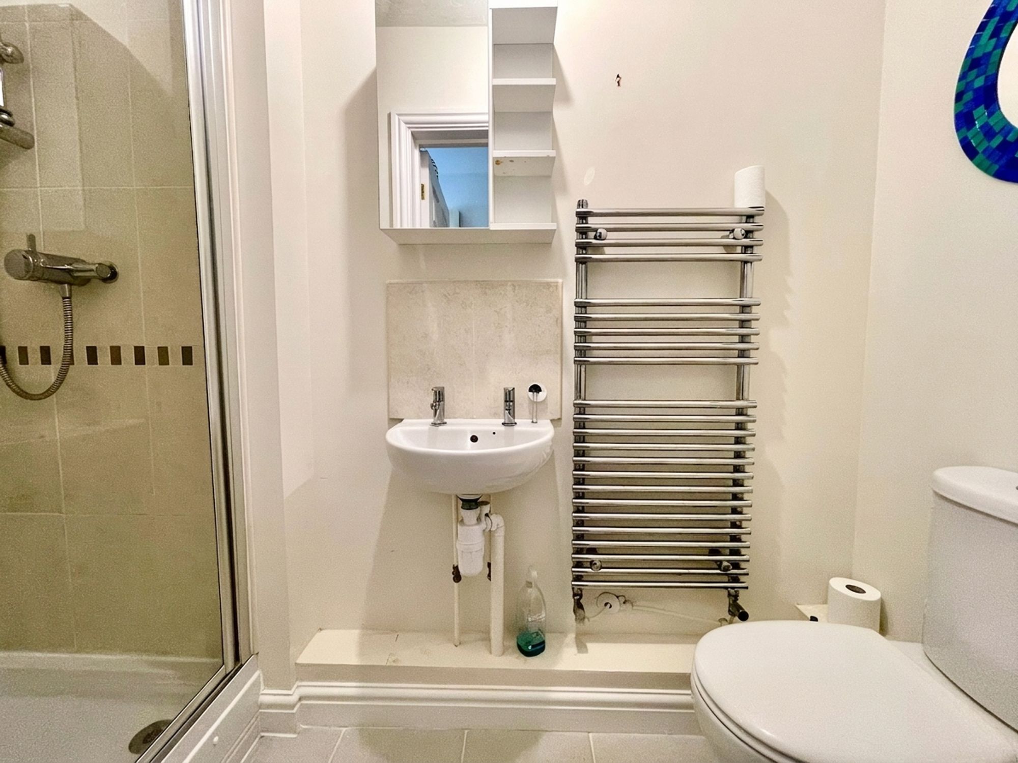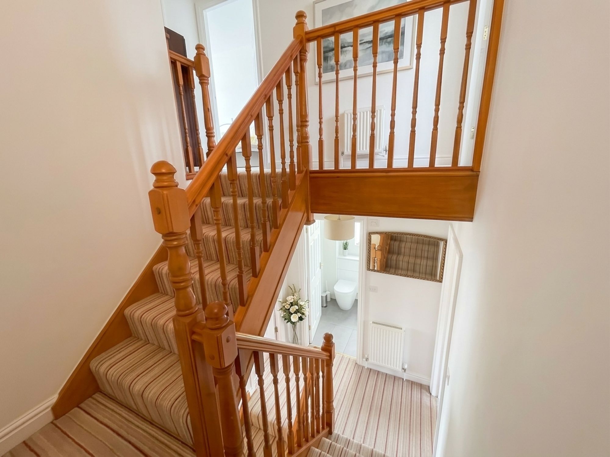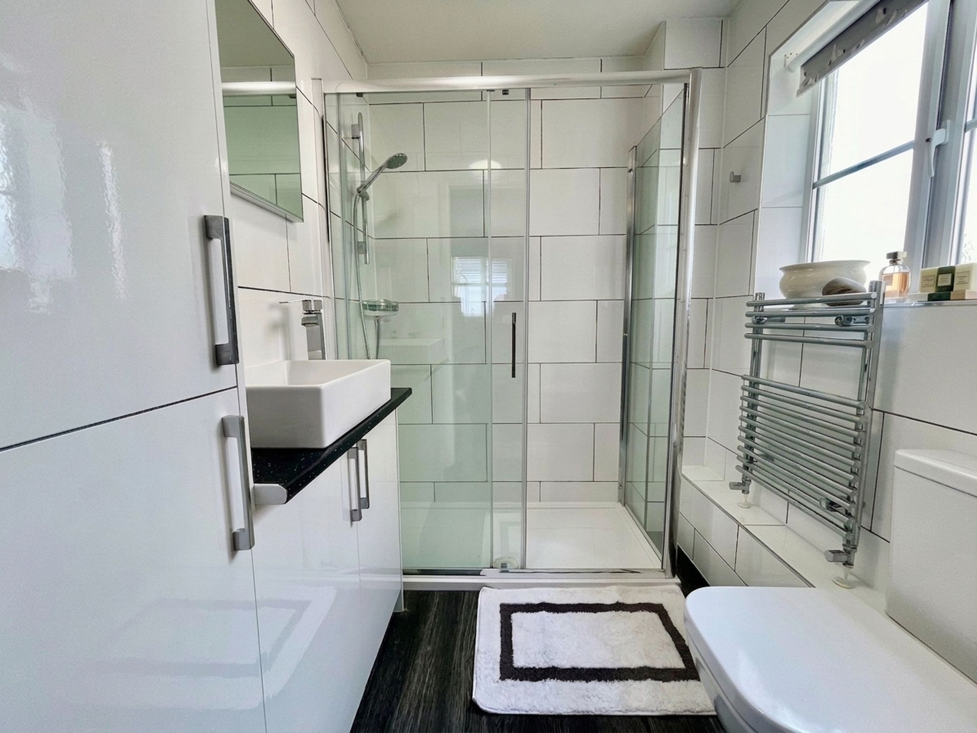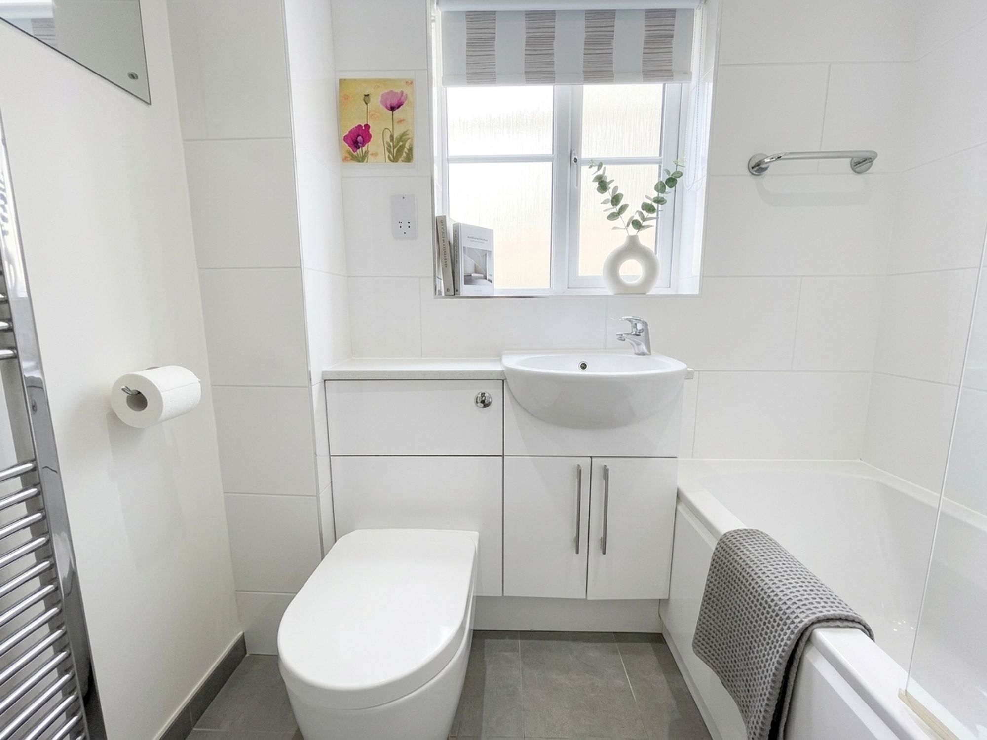 Also on this floor is a beautifully designed family bathroom, finished to a high standard with full-height tiling, a contemporary white suite and chrome heated towel rail.