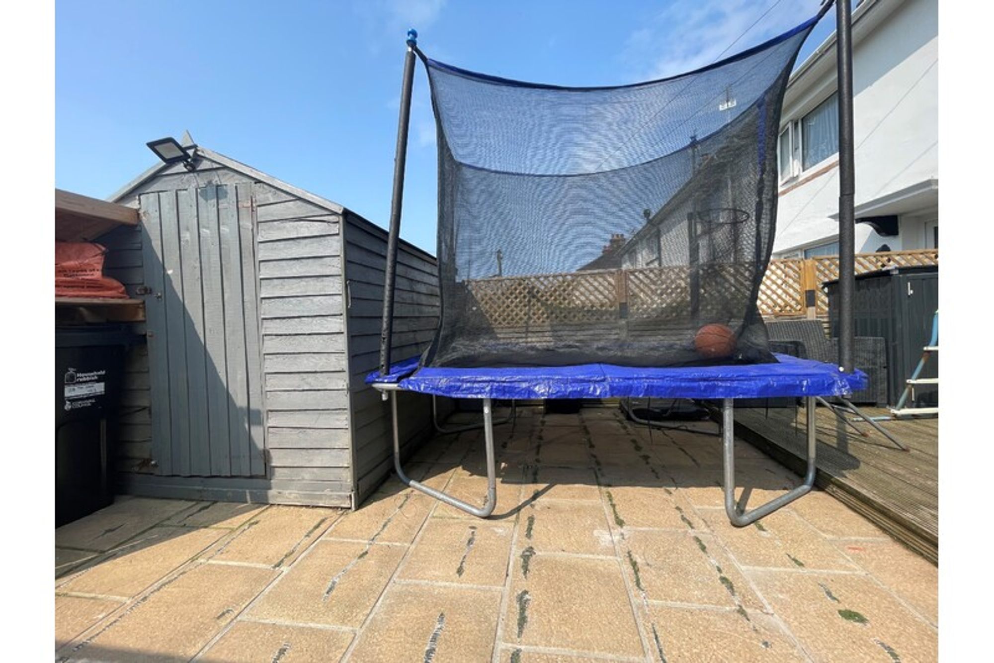The property is set back from the road and approached via a wooden slatted gate leading to a concrete path. To the left is a neat patio area with a raised decked seating space, a handy storage shed, and dedicated storage for bins and recycling.