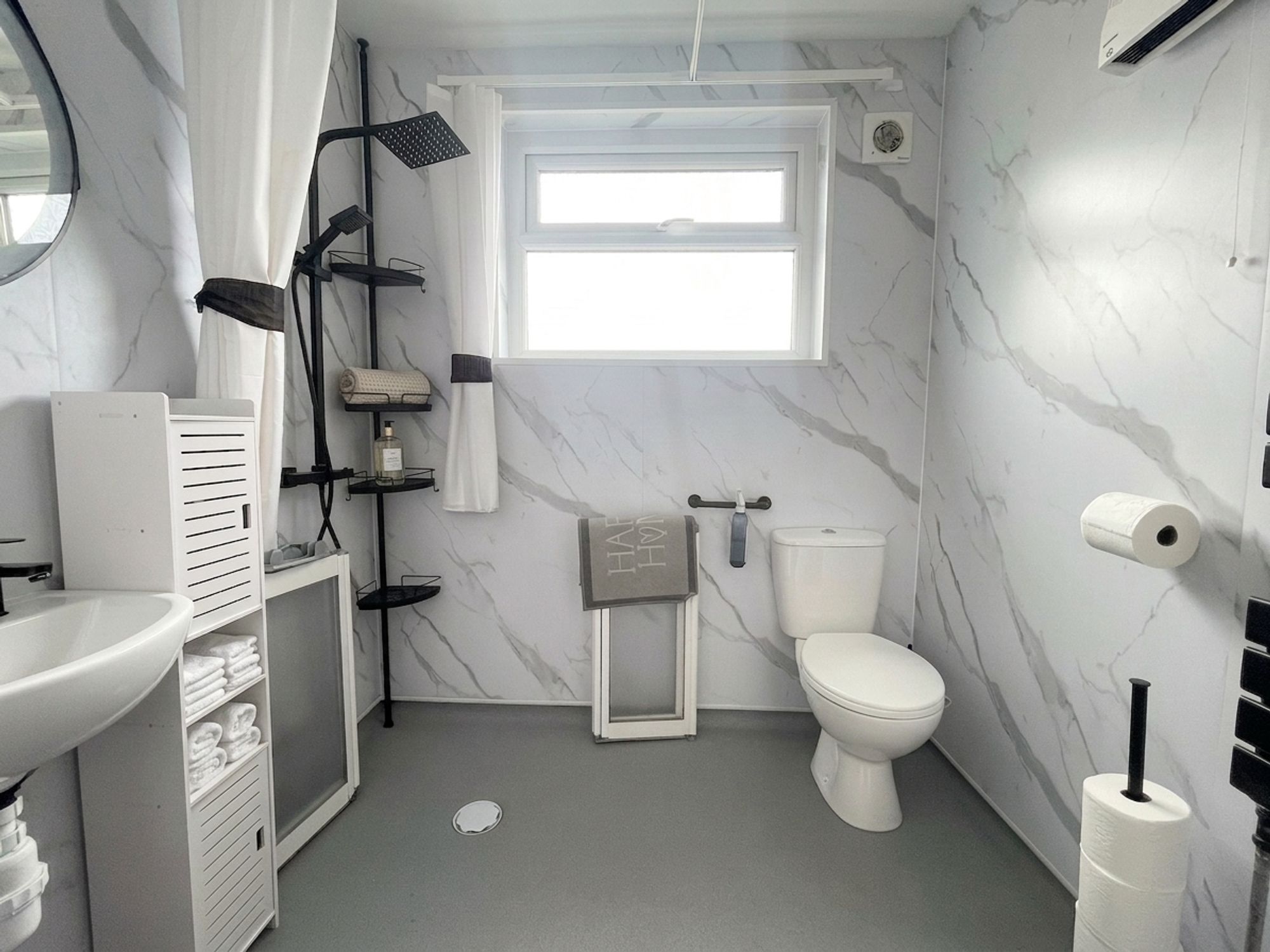 The bathroom has been thoughtfully upgraded and now provides a modern wet room, fitted with non-slip flooring, wall-mounted shower and wash handbasin, heated chrome towel rail, and an obscured UPVC double-glazed window.