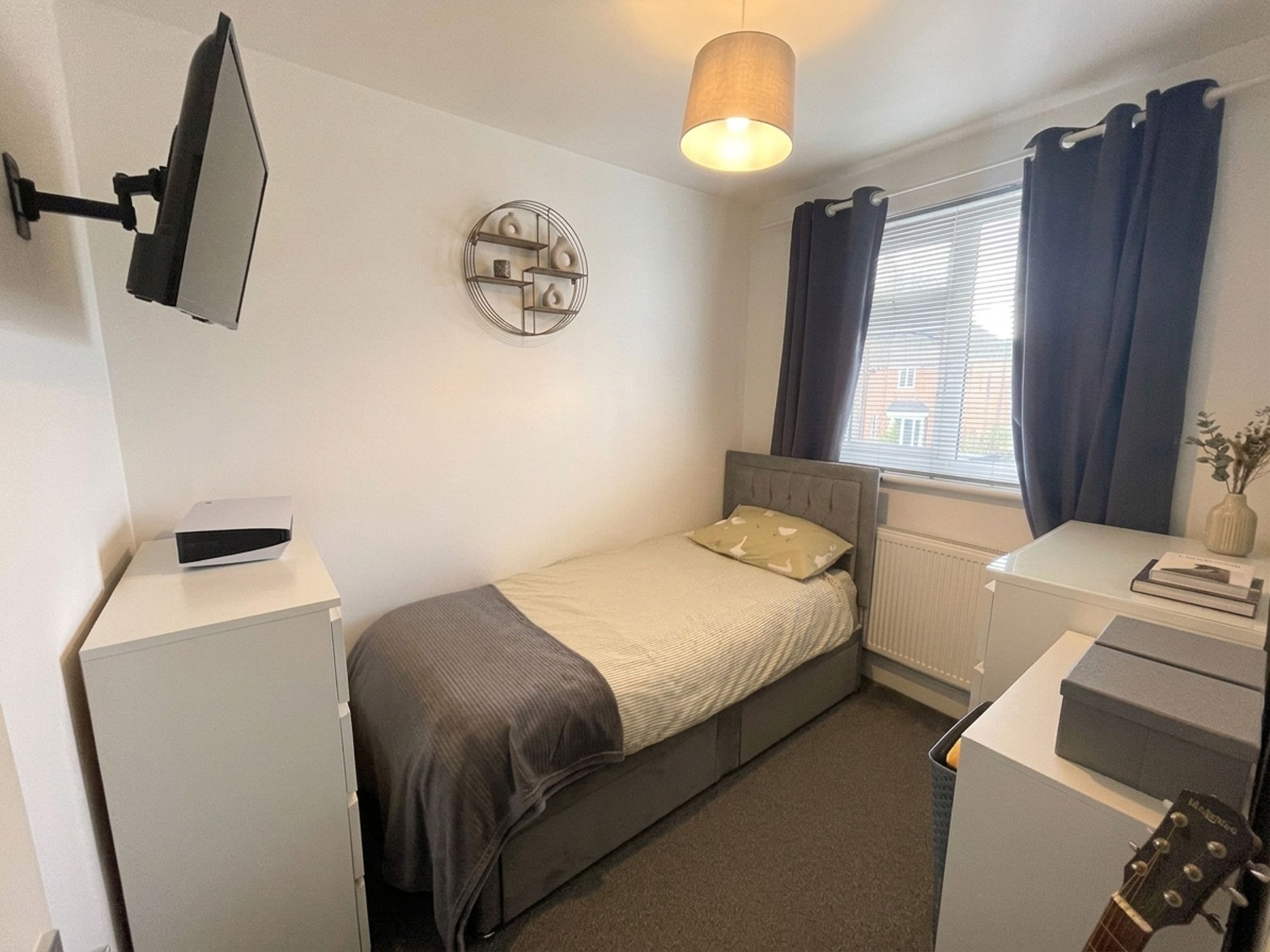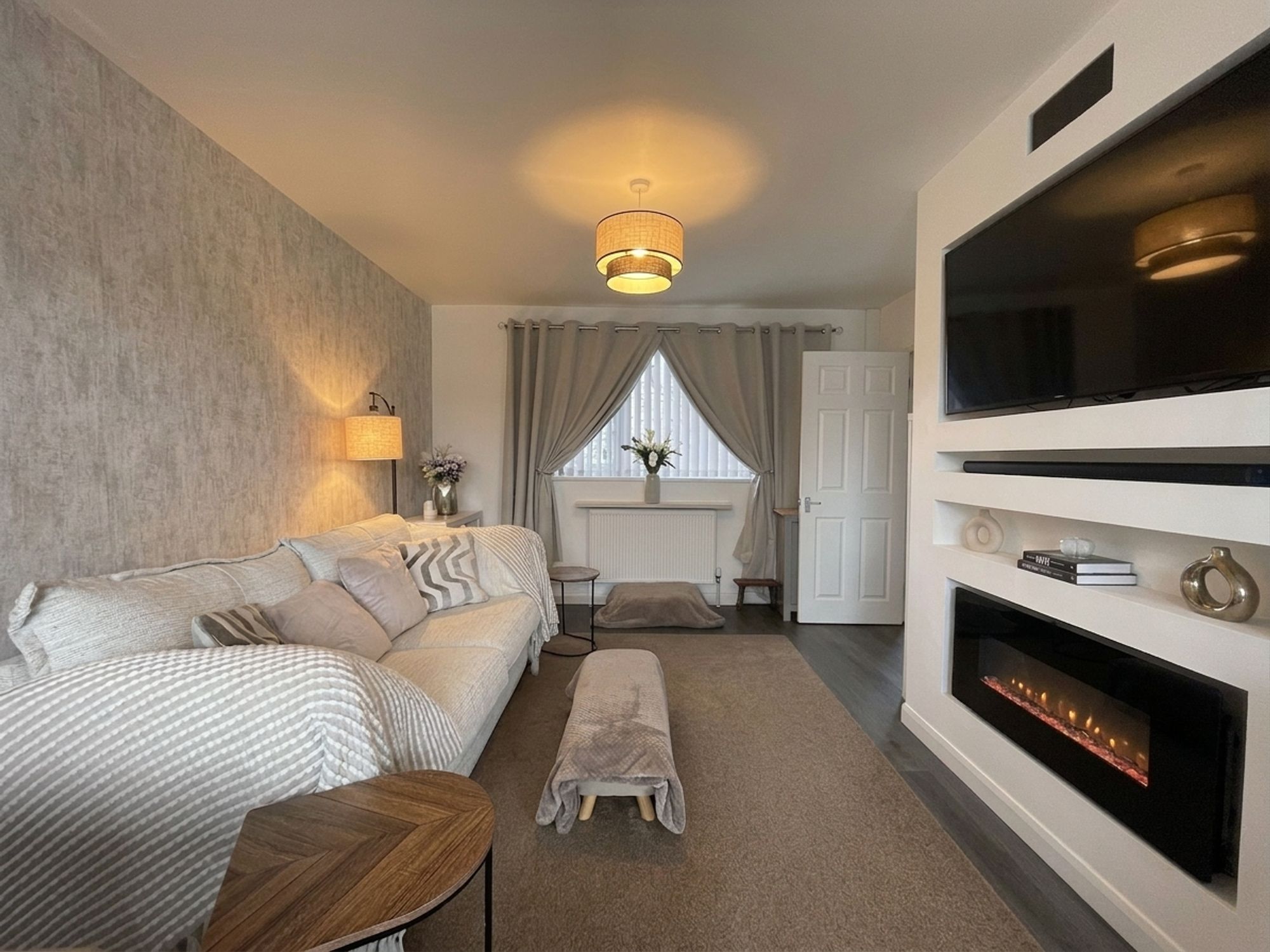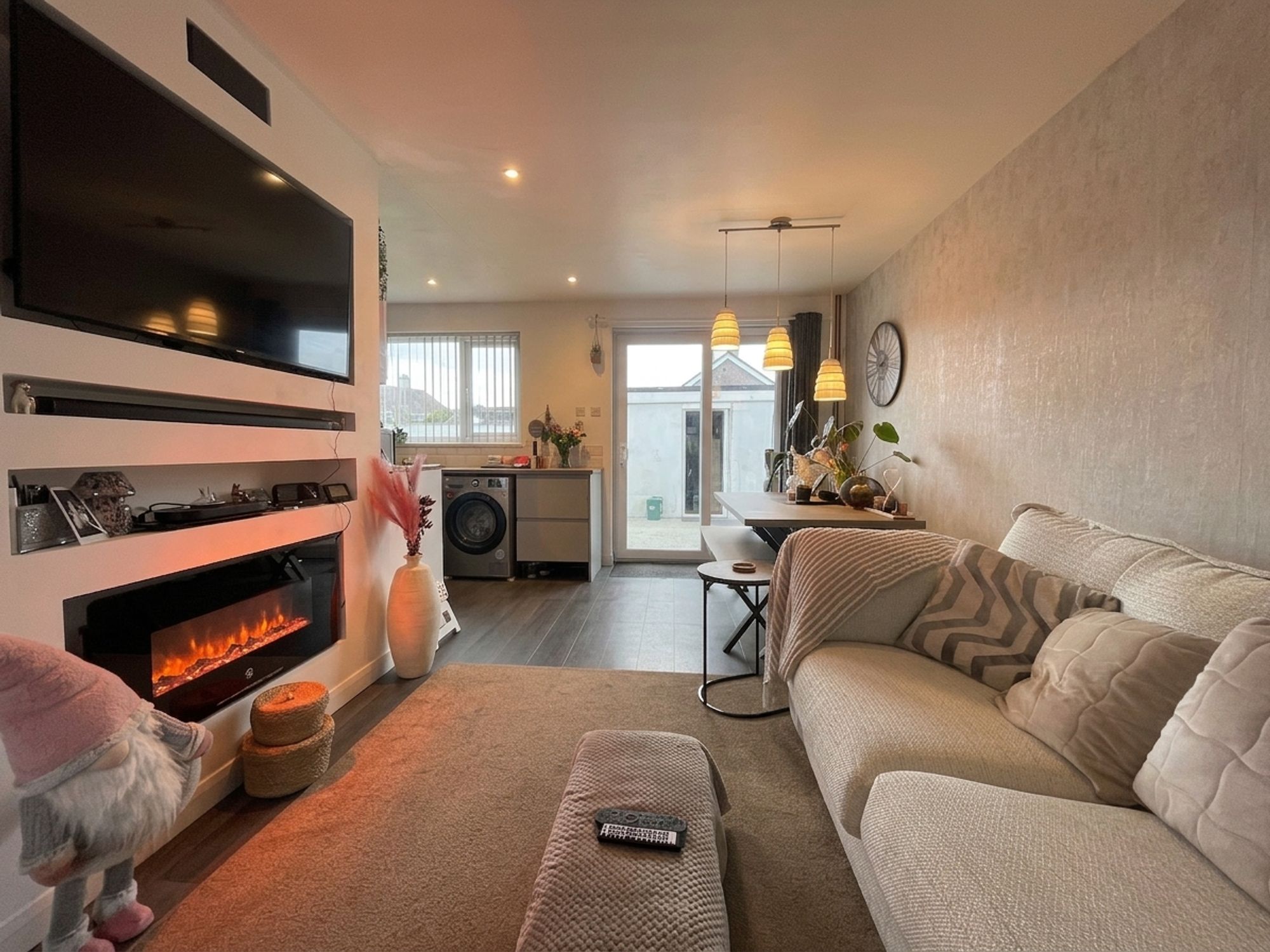 At the heart of the home is the superb open-plan lounge, dining, and kitchen space—perfect for modern family living and entertaining. The lounge is bright and spacious, with a large front-facing UPVC double-glazed window, two radiators, and a striking media wall complete with integrated fire, TV space, and speakers. The dining area flows beautifully into the stylish fitted kitchen, which offers modern grey gloss wall and base units, an inset one-and-a-half bowl sink, hob, integrated Bosch oven, and space for a washing machine, fridge, and dishwasher. To the rear, a window and sliding UPVC patio doors allow for plenty of natural light and provide direct access out to the garden.