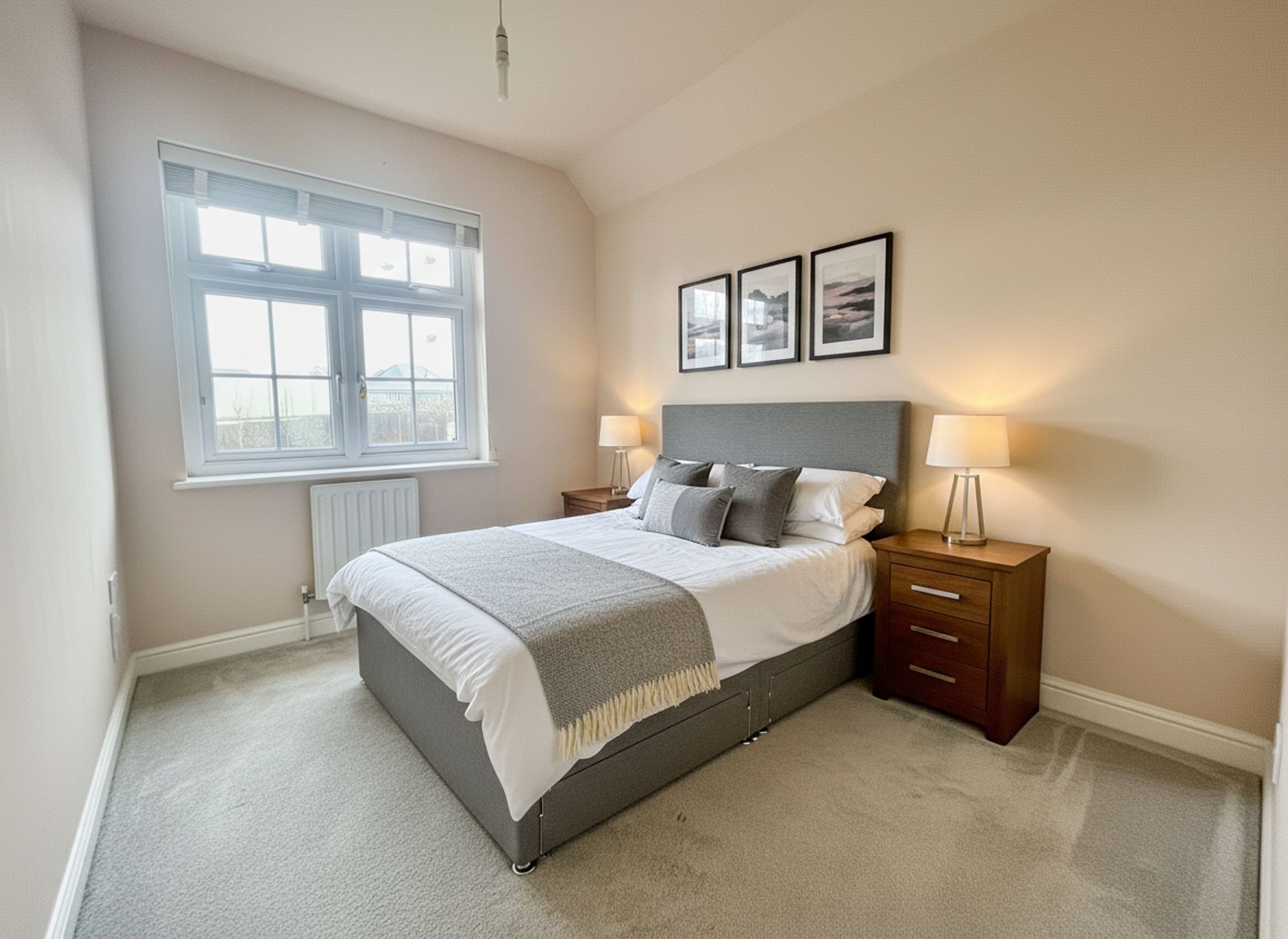 Bedroom TwoA further spacious double bedroom, front-facing, with smooth décor and ample space for freestanding wardrobes.