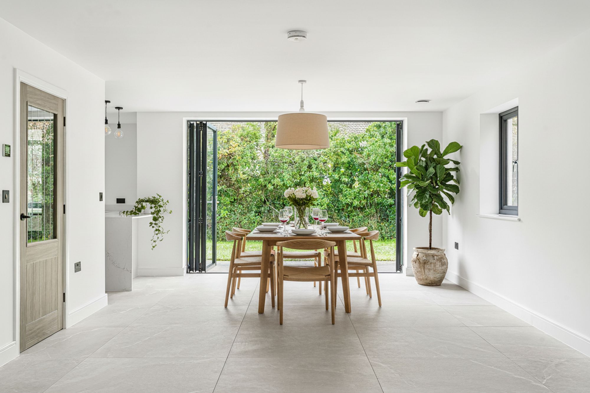 The heart of the home is the impressive 9-metre living room, an elegant yet welcoming space featuring expansive bi-fold doors opening directly onto the west-facing gardens, creating a perfect connection between indoors and out.