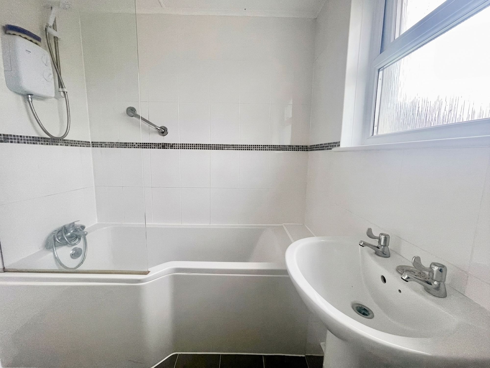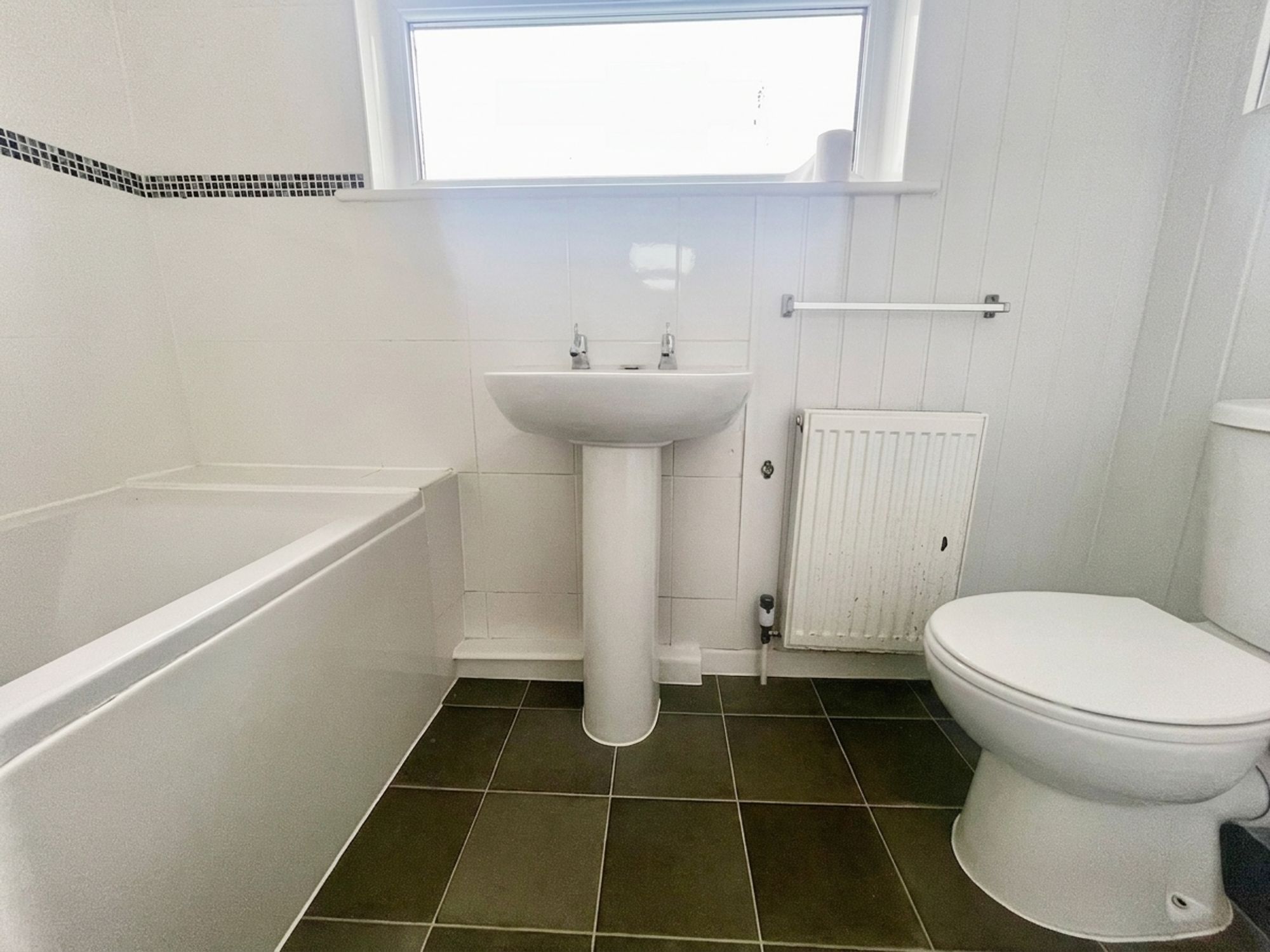 The family bathroom is fitted with a modern white suite, including an L-shaped bath with shower over, pedestal wash hand basin, and WC. The space is finished with contemporary full-height tiling around the bath, vinyl tile-effect flooring, radiator, and an obscured UPVC double-glazed window to the rear. A particularly useful feature is the large airing cupboard, providing excellent additional storage.